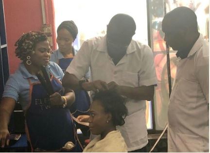 APC governorship candidate, Babajide Sanwo-Olu was spotted today in a saloon in Lagos, making ladies hair including fixing of weavons.