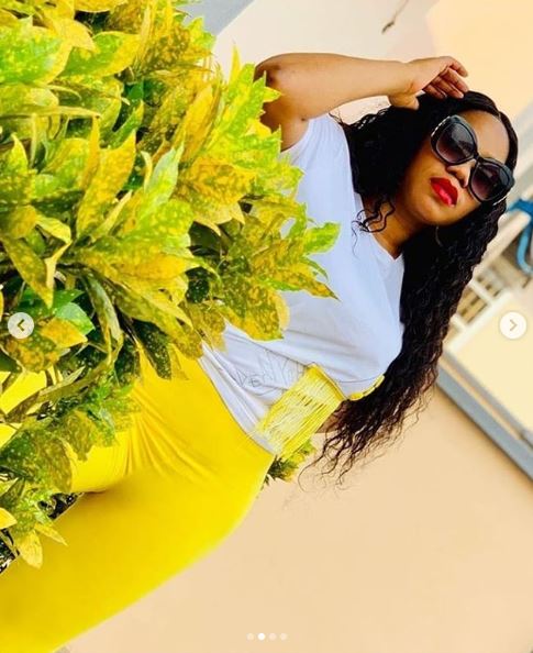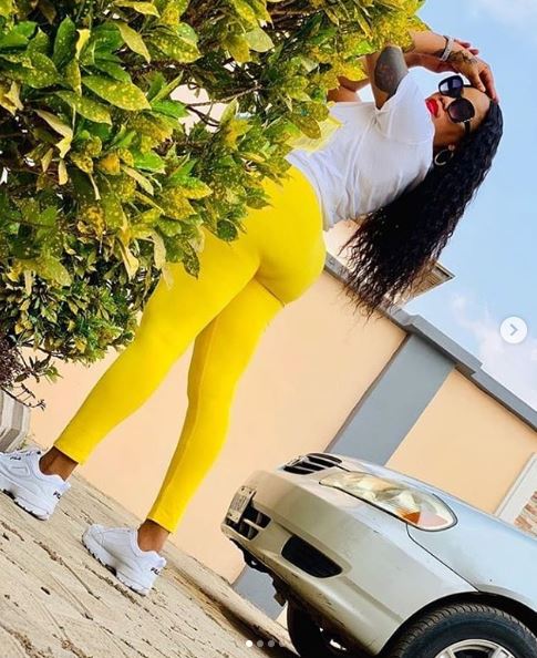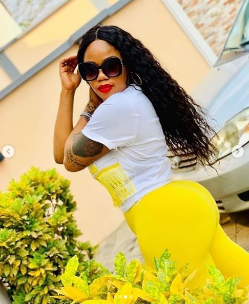 Mother of two, Toyin Lawani flaunted her butt in a skintight yellow trouser.
