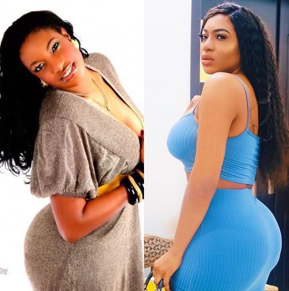 Her old and new pictures show the protruding bum peeping out of her gown. The pictures as seen above were taken 10 years apart