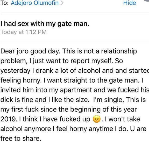 Relationship adviser, Joro Olumofin has shared the story of a young lady who easily slept with a gateman under the influence of alcohol.