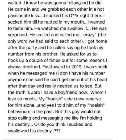 She went to a party, met this young man and went straight to administer oral s*x to him. The experience seems to have trapped the young man over the years.