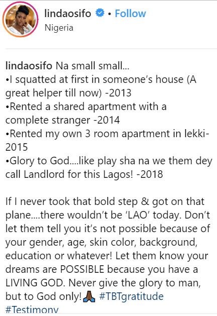 The actress who came to Lagos in 2013, revealed that she is now a 'Landlord' in a post she made on her Instagram page and then went on to chronicle her journey so far.