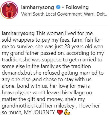 Nigerian singer, Harrysong has spoken out about the truly amazing things his grandmother did to show him love back in the day.