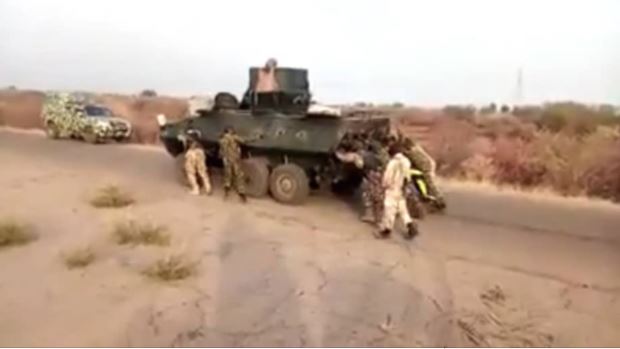 Nigerian soldiers have been filmed pushing a faulty armoured personnel carrier in the north east.