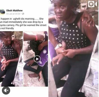 According to a Facebook user, who claimed the young lady must have been used for some money ritual, he wrote; "It happen in ughelli dis morning....... She run mad immediately she was drop by a toyota camery. Pls girl be warned the street is not friendly"