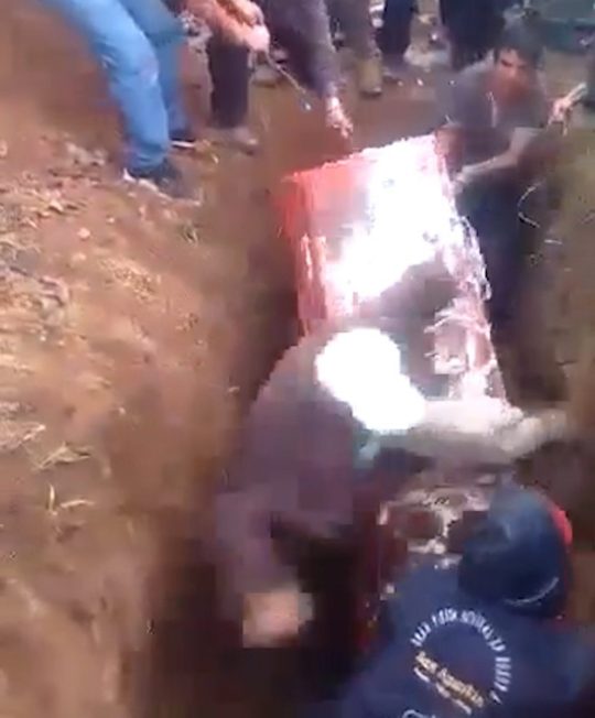 A pallbearer stumbled and fell on top of the coffin as it was being lowered into the ground in front of mourners. People wail in shock while others desperately try to prevent the woman’s corpse from falling out in the district of Pampas, Peru.