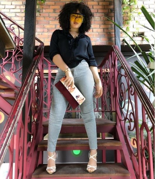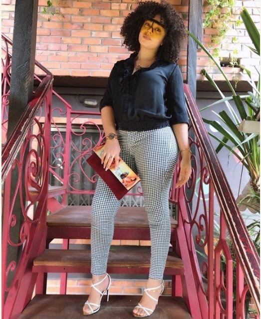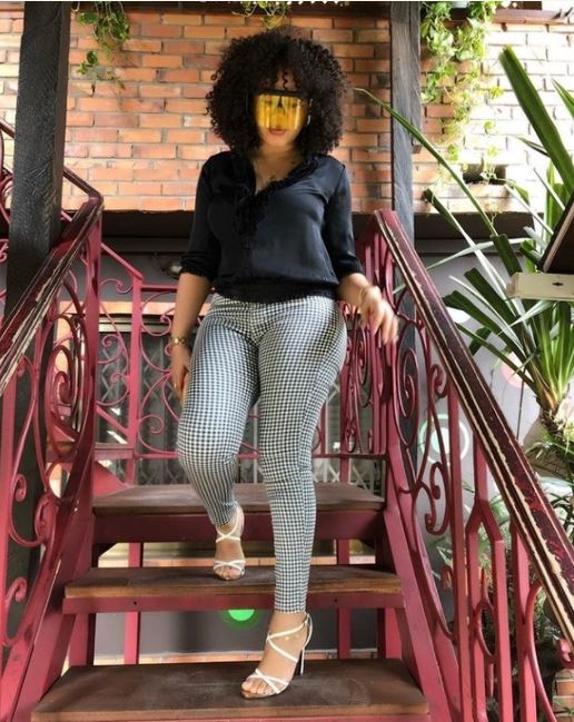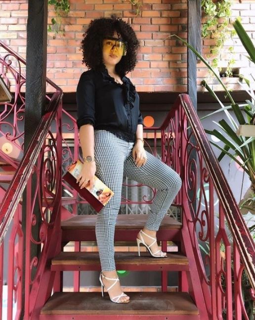 She rocks a print trouser outfit with a black top complimented with a pair of white stilletos and a chic purse.