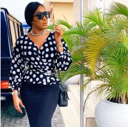 Nollywood queen actress Chika Ike looks beautiful as she steps out for work in adorable polka dot top.