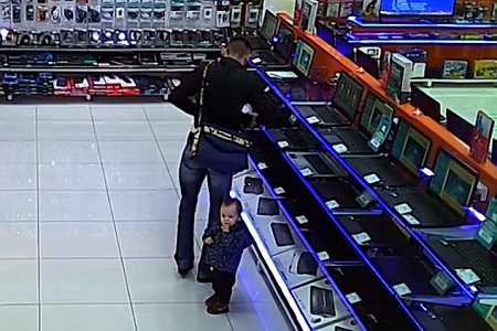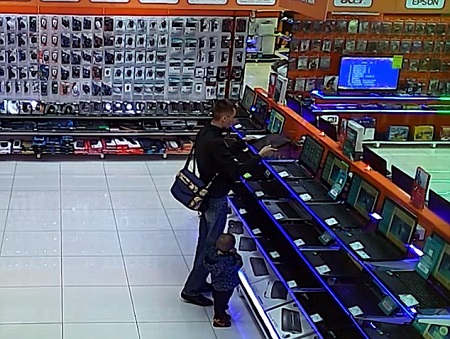 The video starts with the man looking at computers in a shop in Chelyabinsk in Southern Russia. He is accompanied by a toddler, believed to be his son, as he picks up a laptop.