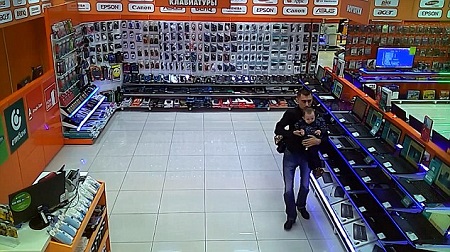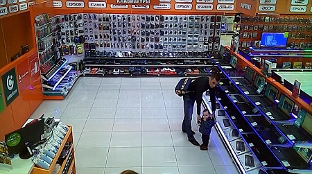 He then picks up his young son and waltzes out of the shop as quickly as possible with the 25,000 roubles (£250) laptop concealed from view.