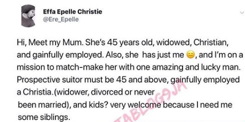 "Hi meet my mim. She's 45 years old, widowed, Christian, and gainfully employed. Also she has just me, and I'm on a mission to match-make her with one amazing and lucky young man. Prospective suitor must be 45 and above, gainfully employed, a christian (widower, divorced or never been married), and kids? very welcome because I need me some siblings."
