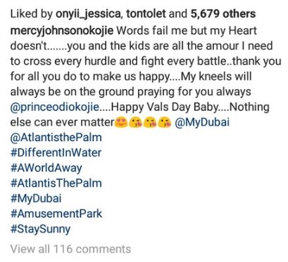 She wrote; "Words fail me but my Heart doesn't.......you and the kids are all the amour I need to cross every hurdle and fight every battle..thank you for all you do to make us happy....My kneels will always be on the ground praying for you always @princeodiokojie....Happy Vals Day Baby....Nothing else can ever matter @MyDubai"