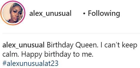 She captioned it: "Birthday Queen. I can’t keep calm. Happy birthday to me. #alexunusualat23"