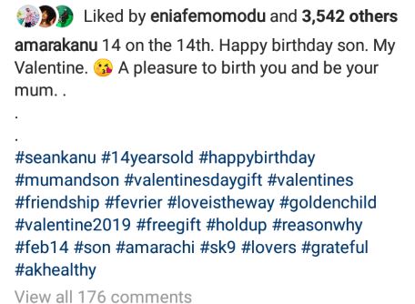Wife of popular Nigerian fooballer Kanu, Amara Kanu celebrates her grown up son Sean Kanu in style as he clocks 14years on valentines day.