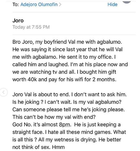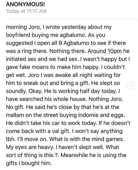 The gist was shared by a relationship blogger, Joro Olumofin.