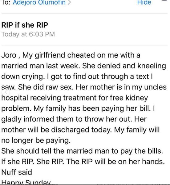 A man whose girlfriend cheated on him has decided to dump her and also withdraw all the financial assistance he has been giving her sick mother.