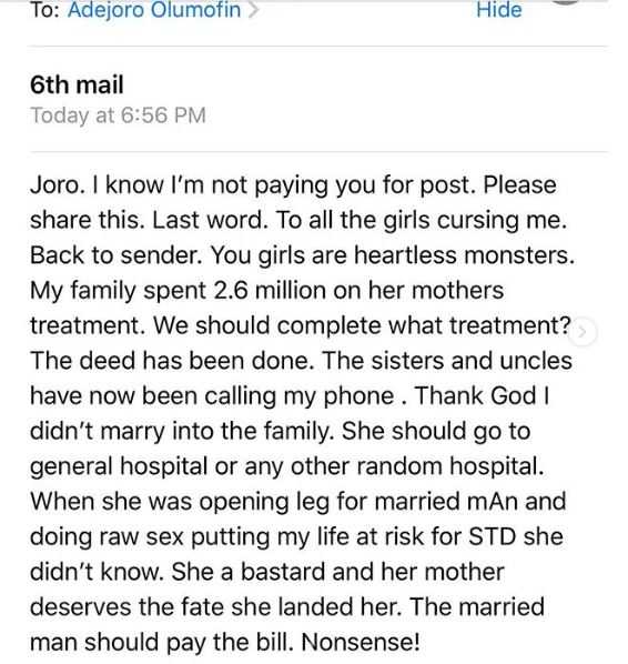 An alleged cheating lady has been left devastated after her estranged lover decided to call it quits and discharge her sick mother whom his family has been paying her hospital bills.