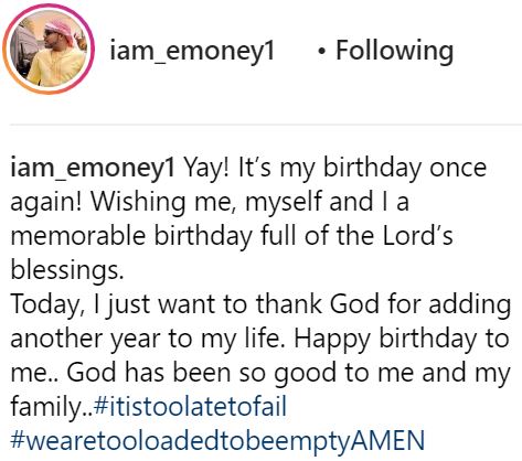 "Today, I just want to thank God for adding another year to my life. Happy birthday to me.. God has been so good to me and my family..#itistoolatetofail #wearetooloadedtobeempty. AMEN."