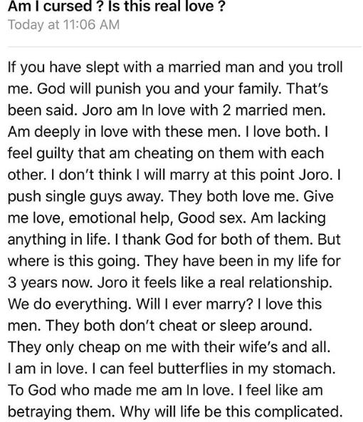 Relationship adviser, Joro Olumofin has shared the story of a lady who is warming the beds of two married men.
