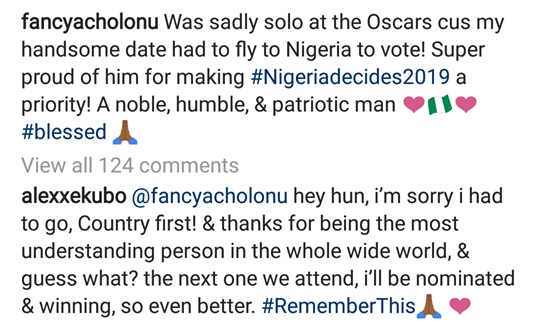 Fancy Acholonu, a model called her man Alex Ekubo a patriotic person after he skipped going for the Oscars with her so he can return to Nigeria and perform his civic duty.