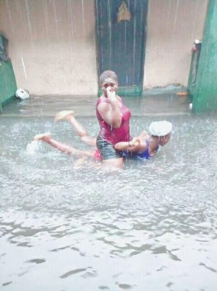 Trending pictures posted online, show the moment the ladies swam and played in the pool during the rainfall.
