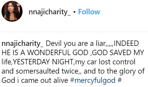 She wrote: "Devil you are a liar,,,,,INDEED HE IS A WONDERFUL GOD ,GOD SAVED MY life,YESTERDAY NIGHT,my car lost control and somersaulted twice,, and to the glory of God i came out alive #mercyfulgod #"