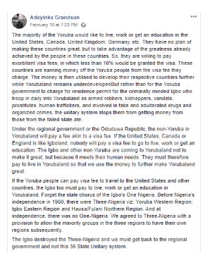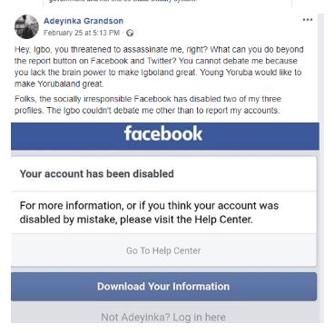 It is alleged that Adeyinka Grandson said some uncomplimentary things about Ibos residing in Lagos after the election and this caused the Biafran man to reply him with threats.
