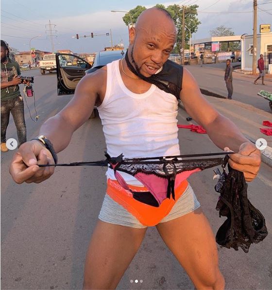 Popular Nollywood figure, Charles Okocha also known as Igwe Tupac caused a scene recently when he flaunted some female underwear in public as he went gaga.