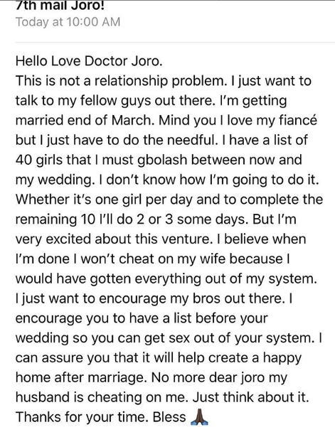He wrote his story to a relationship blogger, Joro Olumofin and called on other men to emulate his model.