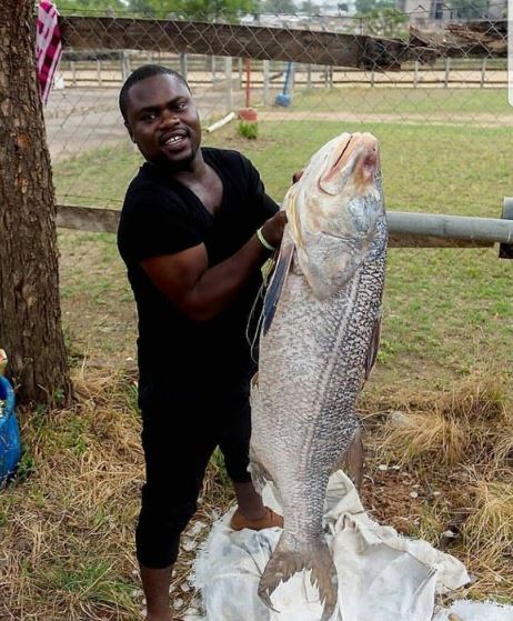 This is a viral picture of a fisherman parading his kill after a successful hunting operation at a nearby waterbody.