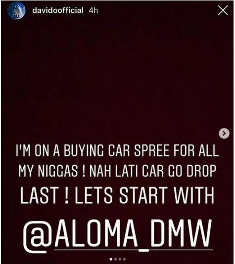 In his recent Instagram story, he revealed he is going on a car-buying spree for them. Not just a few, but all of them in his crew. He has already started off with Aloma DMW whom he bought a brand new Mercedes Benz car.