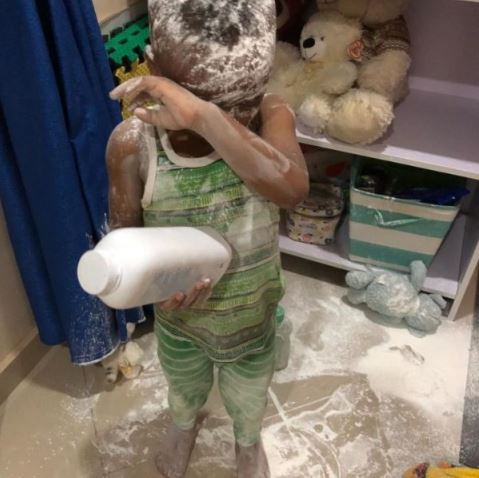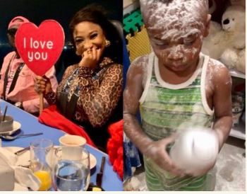 Tonto Dikeh shared hilarious photos of her son, King Andre all covered in baby powder .