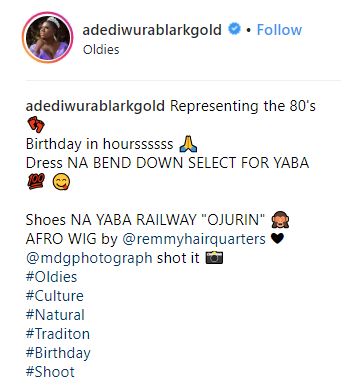As beautiful Nollywood actress, Adediwura Blarkgold prepares for her birthday, she rocks some olden days attire in style.