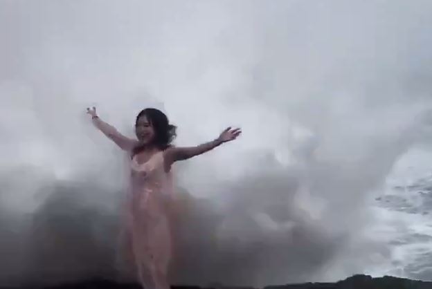 Thankfully the girl survived and was carried out by a man who was also on the rocks in another video posted to Instagram.