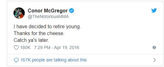 We have, of course, seen something like this before. McGregor tweeted his decision to retire young in 2016. Two days later, he posted a lengthy statement on Facebook that ended with him saying “I AM NOT RETIRED.” So you can draw your own conclusions.