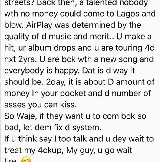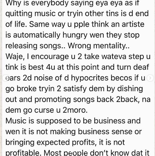 "U quit, u no quit, u are a Legend still. Ur Talent no be here and no be today I see things in ur perspective. Bigup" he captioned his lengthy note to Waje.