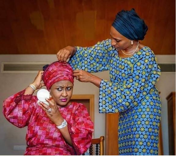 Dolapo helped Mrs Buhari in beautifying her looks by helping her fix the head gear.