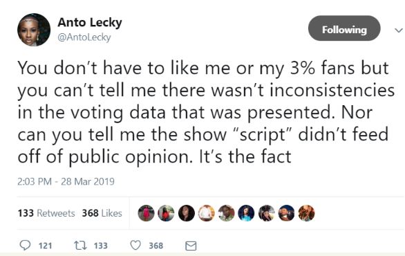 "You don’t have to like me or my 3% fans but you can’t tell me there wasn’t inconsistencies in the voting data that was presented. Nor can you tell me the show “script” didn’t feed off of public opinion. It’s the fact" She tweeted.