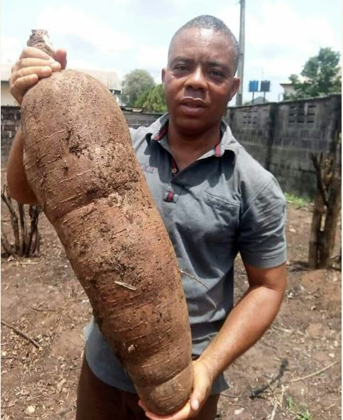A man who has invested in agriculture appears elated after harvesting this massive cassava from his farmland.