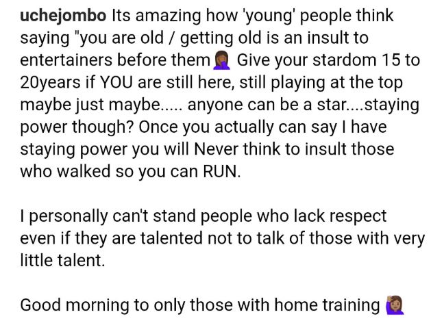 "Its amazing how 'young' people think saying "you are old / getting old is an insult to entertainers before them Give your stardom 15 to 20years if YOU are still here, still playing at the top maybe just maybe..... anyone can be a star....staying power though? Once you actually can say I have staying power you will Never think to insult those who walked so you can RUN.