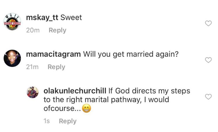 Churchill made this revelation via an online reaction when he was asked if he would get married again. In his response he said, "if God directs my steps to the right marital pathway, I would ofcourse".