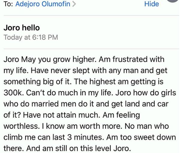 Relationship blogger, Joro Olumofin has shared the story of a lady who claims she isn't making enough from s*x.