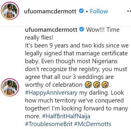 "It's been 9 years and two kids since we legally signed that marriage certificate baby. Even though most Nigerians don't recognize the registry, you must agree that all our 3 weddings are worthy of celebration.