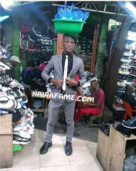 A Nigerian man has been spotted wearing a suit while hawking bottled water in a Lagos market.