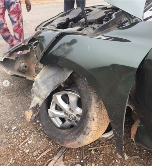 The actress who was travelling in her Toyota Camry popularly known as 'muscle' came out of the car wreck unscathed while the car was badly damaged.