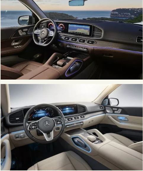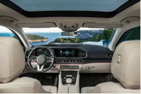 Inside, the 7-passenger luxury SUV features Mercedes's new MBUX infotainment system with a 12.3-inch digital instrument cluster and a 12.3-inch central touchscreen with navigation. Other standard features include a Burmester surround sound system, inductive wireless charging, 64-color ambient lighting, nine USB ports, and Apple Carplay and Android Auto connectivity.