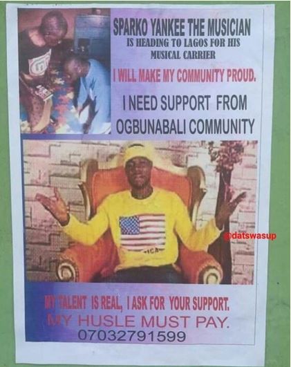A budding artiste, Sparko Yankee is calling on the residents of his community to fund his relocation to Lagos to pursue his musical career.