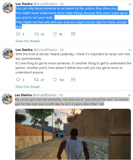 Leo Dasilva in new tweets, disclosed that his family is pushing him to get married just after his cousin took the forever path with his heartthrob.