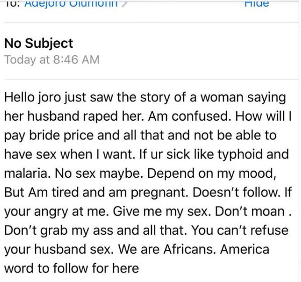 Its a rarity for a husband to rape his wife but this seems to be playing out in the marriage this woman just got into.