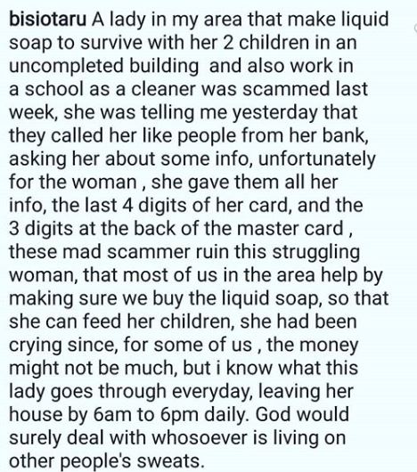 The comedian shared the sad story of a poor woman who was scammed recently. The woman was revealed to be a struggling lady who works hard everyday to work, care for her children and pay her bills.